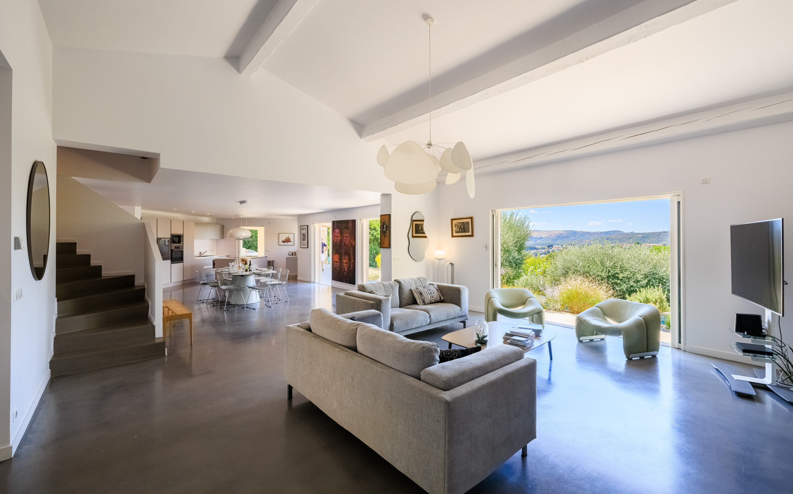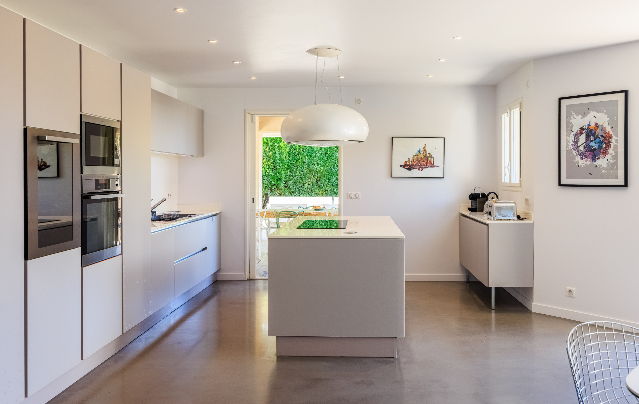 The fully equipped open kitchen features high-end appliances and opens onto a bright living area with direct access to the terrace and pool — ideal for relaxed indoor-outdoor living.