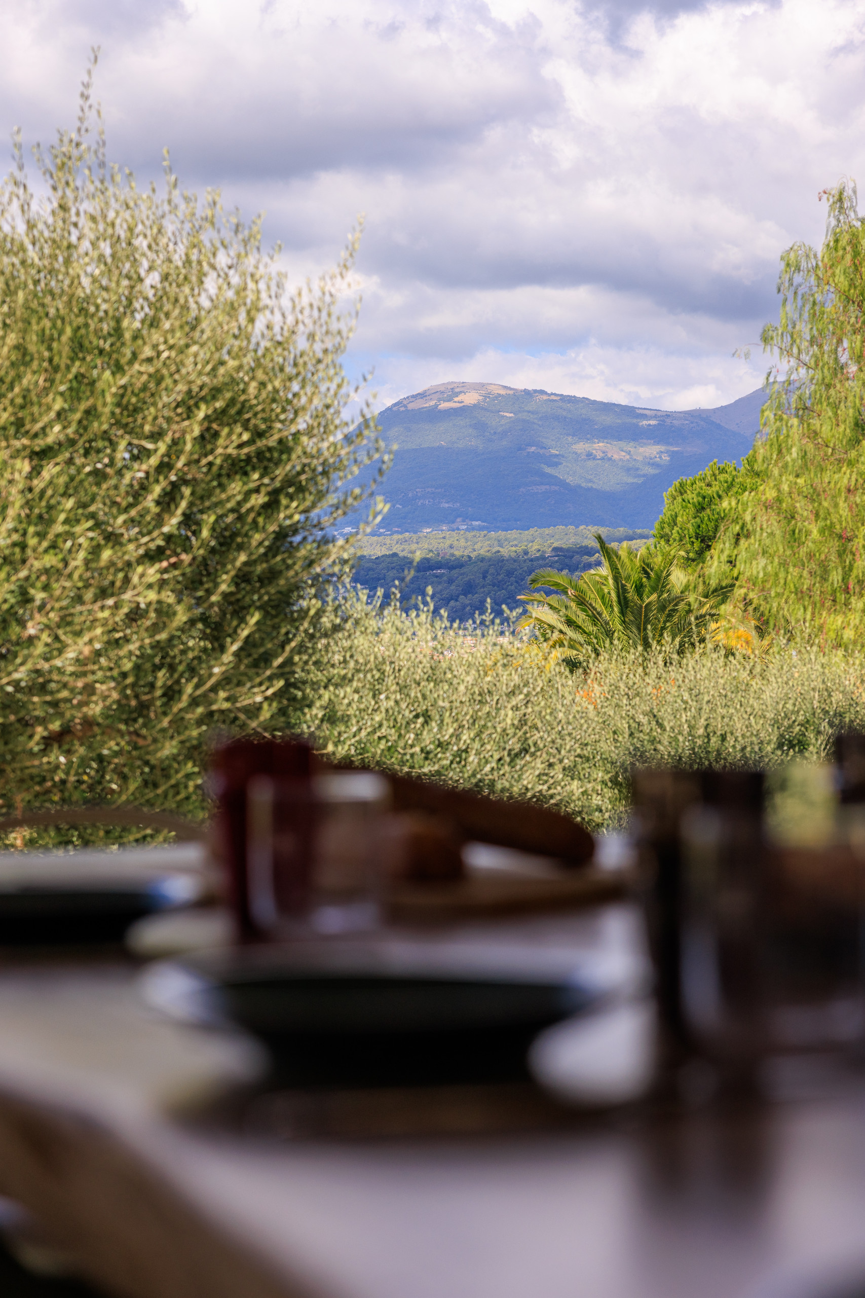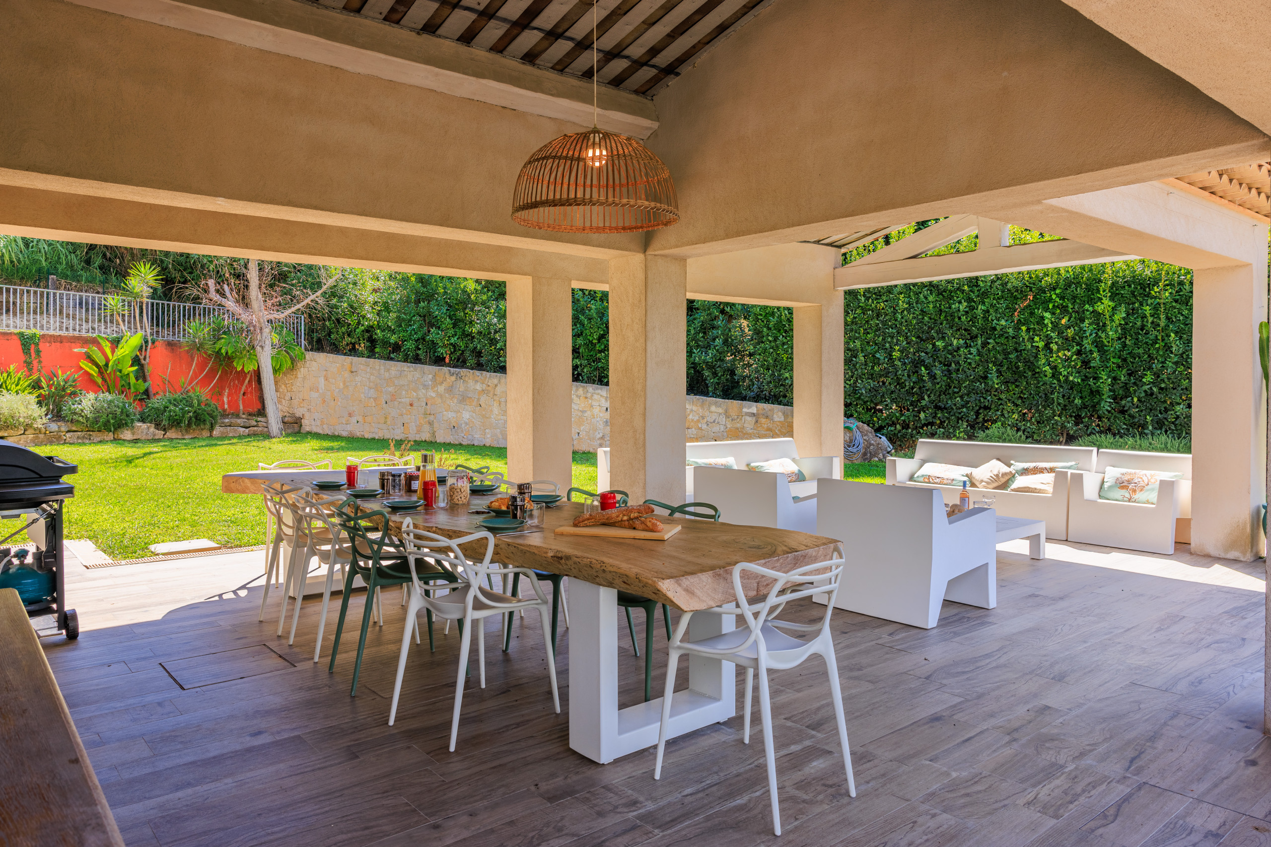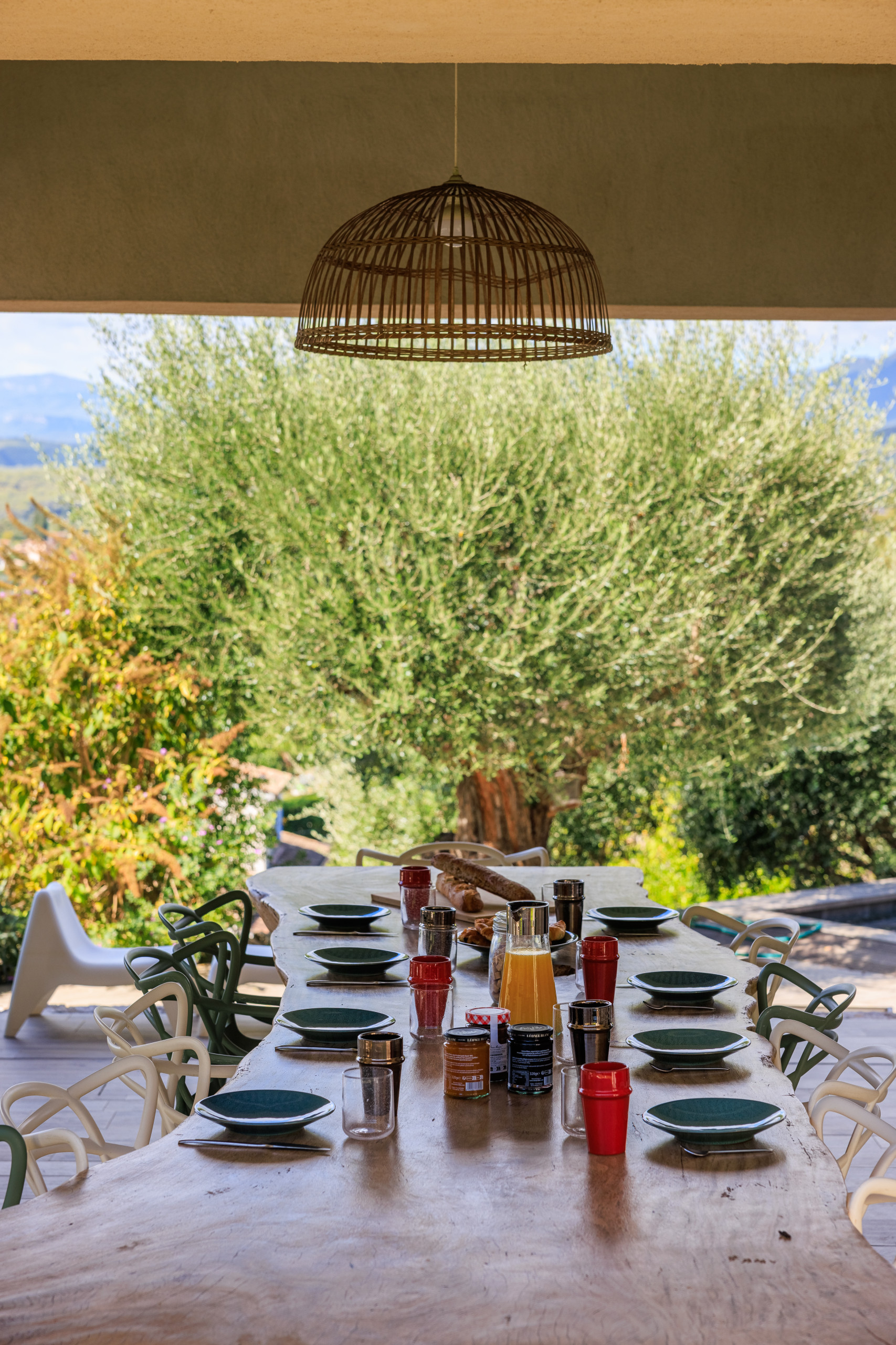 Enjoy a large shaded terrace with modern lounge, dining table, and a lush Mediterranean garden with an ancient olive tree.