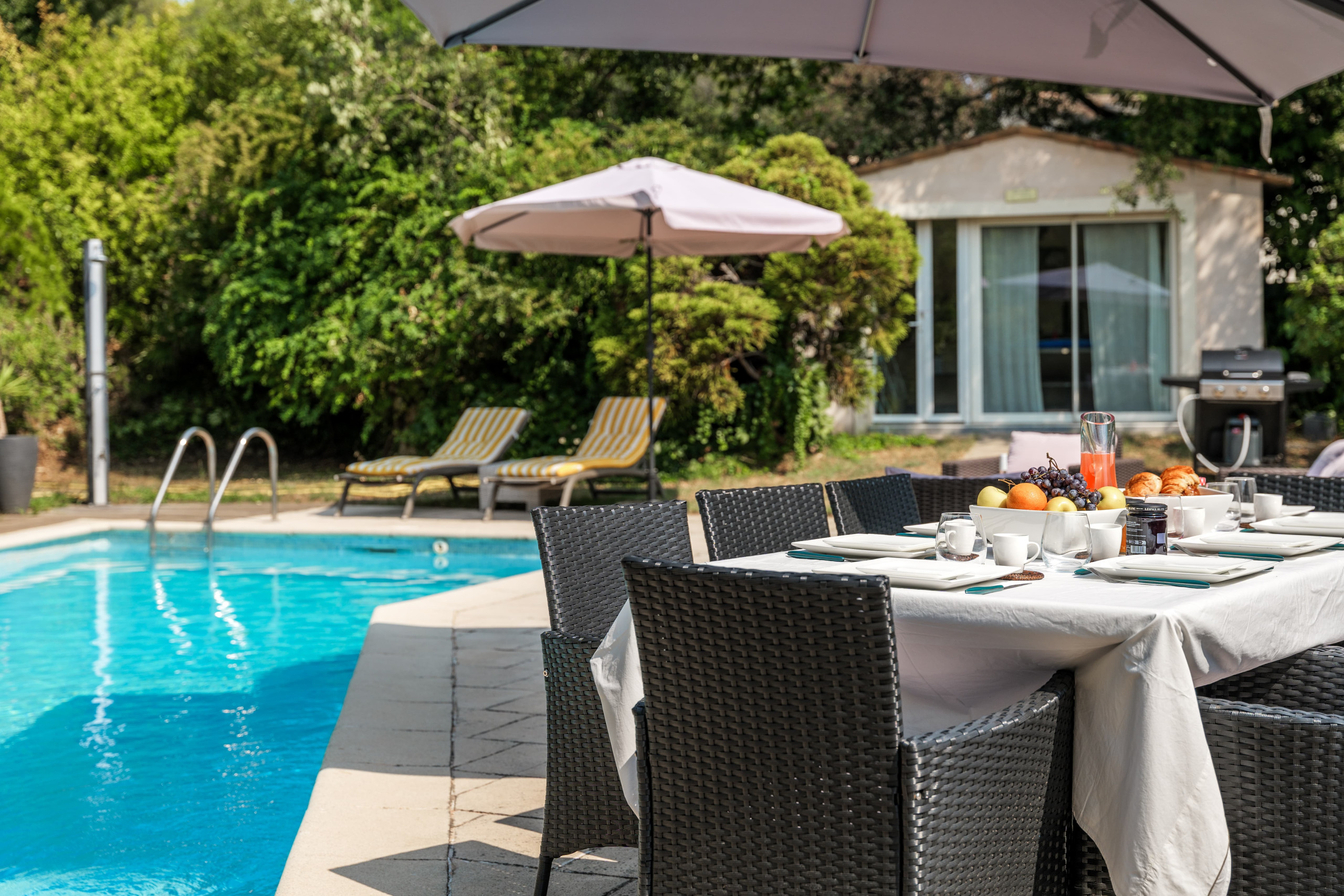 Dès votre arrivée, vous serez séduit par la piscine privée et ses transats accueillants. La terrasse spacieuse devient naturellement le cœur de la maison : de longs déjeuners à l'ombre des parasols, des apéritifs entre amis au bord de l'eau, ou simplement en profitant des douces nuits d'été.